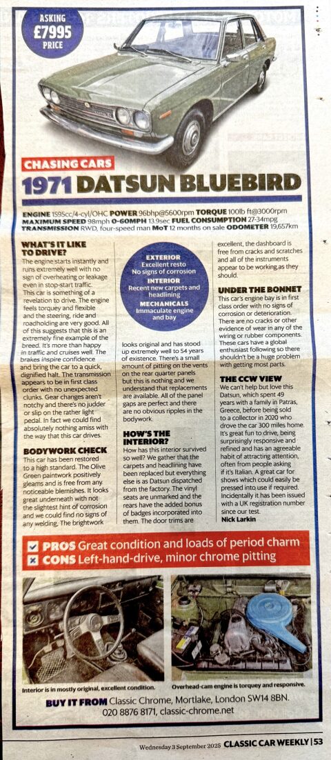 With its success in international rallying, the 510 helped establish Nissan’s reputation for engineering excellence and global motorsport credibility. Today, the model remains highly regarded among collectors in Japan, the USA, and Australia — but is exceptionally rare in the UK.